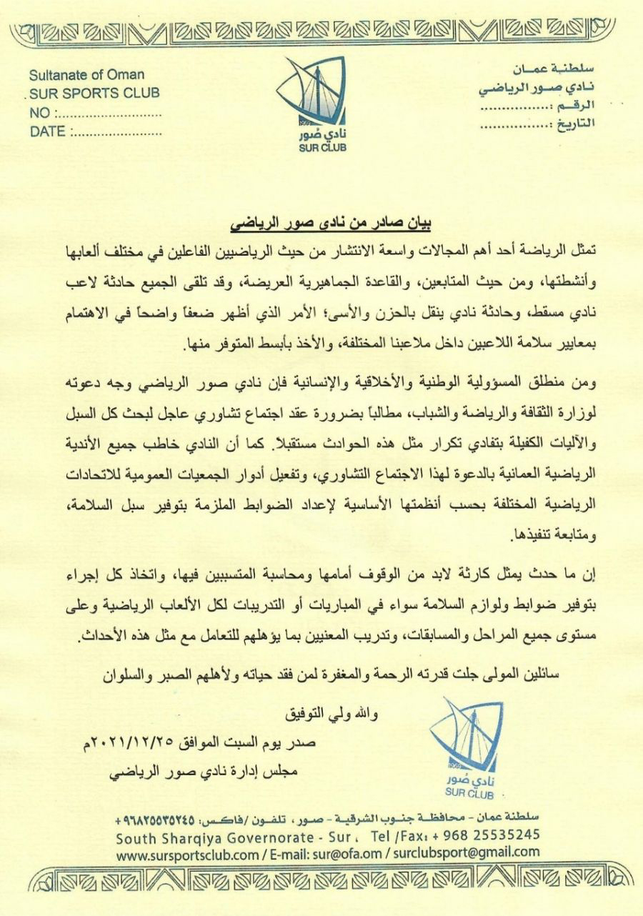 دعى نادي صور الرياضي في بيان له لعقد اجتماع تشاوري بين أندية سلطنة عمان ووزارة الثقافة والرياضة والشباب لمناقشة حادثة وفاة لاعب نادي مسقط مخلد الرقادي – رحمه الله -.