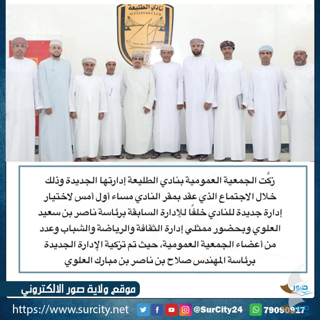 زكَّت الجمعية العمومية بنادي الطليعة إدارتها الجديدة وذلك خلال الاجتماع الذي عقد بمقر النادي مساء أول أمس لاختيار إدارة جديدة للنادي خلفًا للإدارة السابقة برئاسة ناصر بن سعيد العلوي وبحضور ممثلي إدارة الثقافة والرياضة والشباب وعدد من أعضاء الجمعية العمومية، حيث تم تزكية الإدارة الجديدة برئاسة المهندس صلاح بن ناصر بن مبارك العلوي والدكتور حمد بن علي بن عبدالله العلوي نائبًا للرئيس وحديد بن سبيت بن حساني العلوي أمينًا للسر وأحمد بن ماجد بن عبدالله العلوي أمينًا للصندوق وعضوية كل من المهندس محمد بن ناصر بن عبدالله العلوي ومنير بن أحمد بن مسلم العلوي ونصر بن سعيد بن ناصر العلوي والشيخ عبدالحكيم بن علي بن مسلم العلوي وهادي بن مسلم بن عبدالله العلوي.