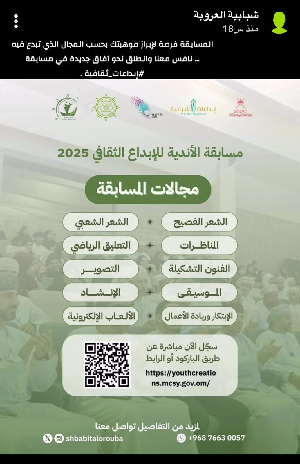 بدأت اللجنة الشبابية بنادي العروبة الرياضية استعداداتها للمشاركة في مسابقة الأندية للإبداع الثقافي ٢٠٢٤-٢٠٢٥ م حيث بدأت بسلسلة من الاجتماعات وتهيئة الظروف للعمل وفق خطط منظمة وأسس متينة تضمن لها النجاح ، وباشرت اللجنة بالإعلان عن المسابقة من خلال مختلف وسائل الإعلام المتاحة والمعروفة ، وأيضا نفذت مجموعة من الزيارات الميدانية لمختلف المؤسسات التعليمية بالولاية وحسب الفئات المستهدفة في المسابقة من الجنسين ضمن وفق الأعمار المحددة مابين فئة ١٠-١٦ سنة وأيضًا فئة ١٧-٢٩ سنة.