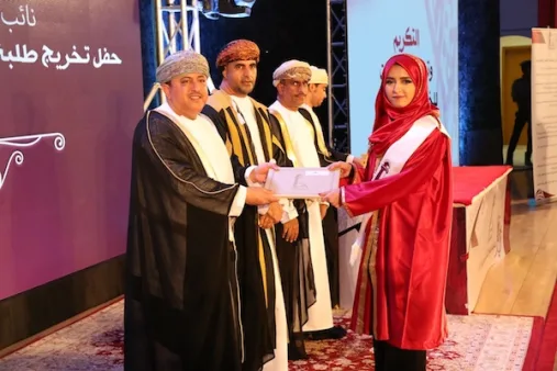 وتواصلت فقرات الاحتفال حيث ألقت الخريجة يسرى سعيد المقبالي تخصص الاتصال الجماهيري قصيدة شعرية بعنوان بصمة فرح نالت على أعجاب الحضور ثم قام سعادة راعي المناسبة بتسليم الهدايا التذكارية للطلبة للمجيدين والمجيدات وتسليم شهادات التخرج لكافة الخريجين ثم قدم سعادة الدكتور عبدالله بن محمد الصارمي وكيل وزارة التعليم العالي هدية تذكارية لسعادة راعي المناسبة