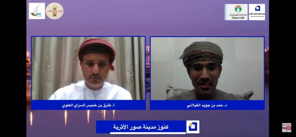 وقدم المحاضرة الدكتور حمد بن محمد الغيلاني خبير بيئي ونائب رئيس لجنة كتاب وأدباء جنوب الشرقية وأدارها طارق السراي العلوي باحث في التاريخ العماني وعضو الجمعية العمانية للكتاب والأدباء وذلك عبر الاتصال المرئي بمنصة الفنر للعلم والمعرفة وموقع مدينة صور