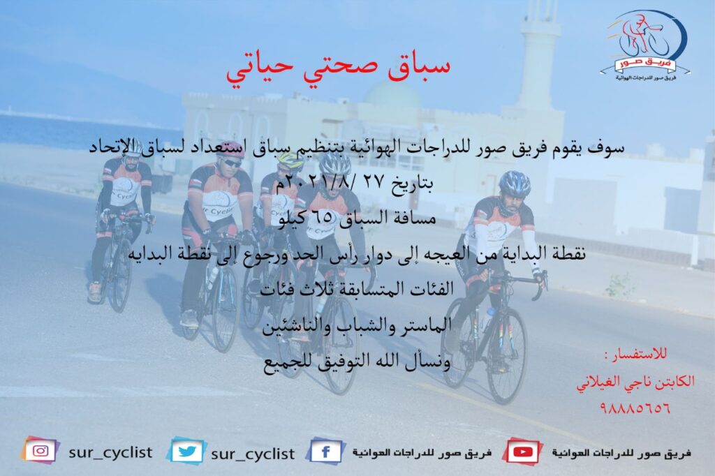ينظم فريق صور للدراجات الهوائية تحت مظلة الجمعية العمانية للسرطان فرع الشرقية يوم غد الجمعة س ٧ صباحا ،سباق صحتي حياتي وذلك تعزيز لمبدأ الرياضة جزء من حياتي وجمع عدد من الدراجين المتميزين وتبادل الخبرات في ما بينهم وتشجيع الجيل القادم على ممارسة هذه الرياضة الجميلة
