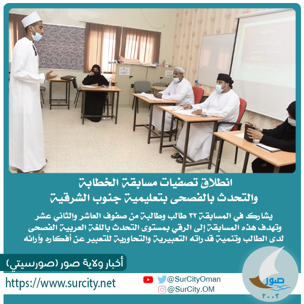 انطلقت بتعليمية جنوب الشرقية اليوم الأثنين تصفيات مسابقة الخطابة والتحدث بالفصحى على مستوى المحافظة للعام الدراسي 2021/2022 م والتي تأتي تحت اشراف قسم الأنشطة التربوية بدائرة التوجيه المهني والإرشاد الطلابي وذلك ضمن استعدادات المحافظة للمشاركة في مسابقة الخطابة والتحدث بالفصحى على مستوى الوزارة حيث يشارك في المسابقة 32 طالب وطالبة من صفوف العاشر والثاني عشر وتقام على مدى يومين