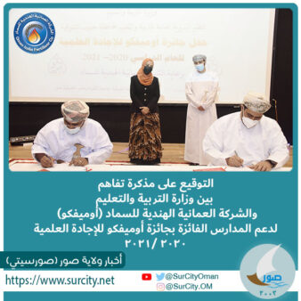 تم اليوم بولاية صور بمحافظة جنوب الشرقية التوقيع على مذكرة تفاهم بين وزارة التربية والتعليم ممثلة والمديرية العامة للتربية والتعليم بمحافظة جنوب الشرقية والشركة العمانية الهندية للسماد (أوميفكو) وذلك لدعم المدارس الفائزة بجائزة أوميفكو للإجادة العلمية 2020 /2021