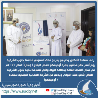 رعى سعادة الدكتور يحي بن بدر بن مالك المعولي محافظ جنوب الشرقية يوم أمس حفل تدشين جائزة أوميفكو للعمل البلدي ( إنجاز2) لعام 2022م في مجال الصحة العامة ونظافة البيئة والتي تنفذها بلدية جنوب الشرقية للعام الثاني على التوالي وبدعم من الشركة العمانية الهندية للسماد ( أوميفكو) حيث حضر التدشين اصحاب السعادة الولاة وأعضاء المجلس البلدي بالمحافظة والمهندس عبدالله بن سالم الحجري مدير عام بلدية جنوب الشرقية والمهندس خالد بن محمد بن ناصر الفنه مدير الاستدامة والتواصل المؤسسي بالشركة العمانية الهندية للسماد ( أوميفكو) وموظفي الشركة