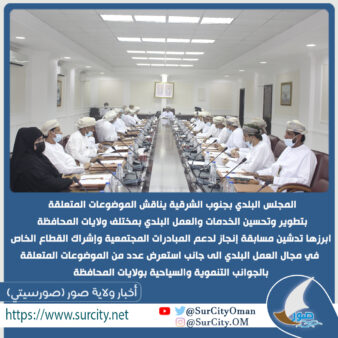 كما بحث المجلس البلدي ظاهرة إنتشار مخلفات الصيادين على الشواطئ الممتدة على الشريط الساحلي لولايات المحافظة وتسريبات المياه في منطقة جبل العيد بولاية صور ومشروع المجمع السكني في المنطقة الصناعية بولاية صور والاطلاع على عدد من ردود المؤسسات حول مطالبات الأهالي منها رد المديرية العامة للخدمات الصحية بالمحافظة حول الطالبة بتوسعة وتأهيل مركز صحي الأشخرة ورد المديرية العامة للإسكان والتخطيط العمراني على مطالبات أهالي منطقة أبوقلع بولاية صور إلى جانب مناقشة الموضوعات والمستجدات المطروحة على جدول الاعمال بما يخدم الارتقاء بالمستوى الخدمي وتطوير المحافظة