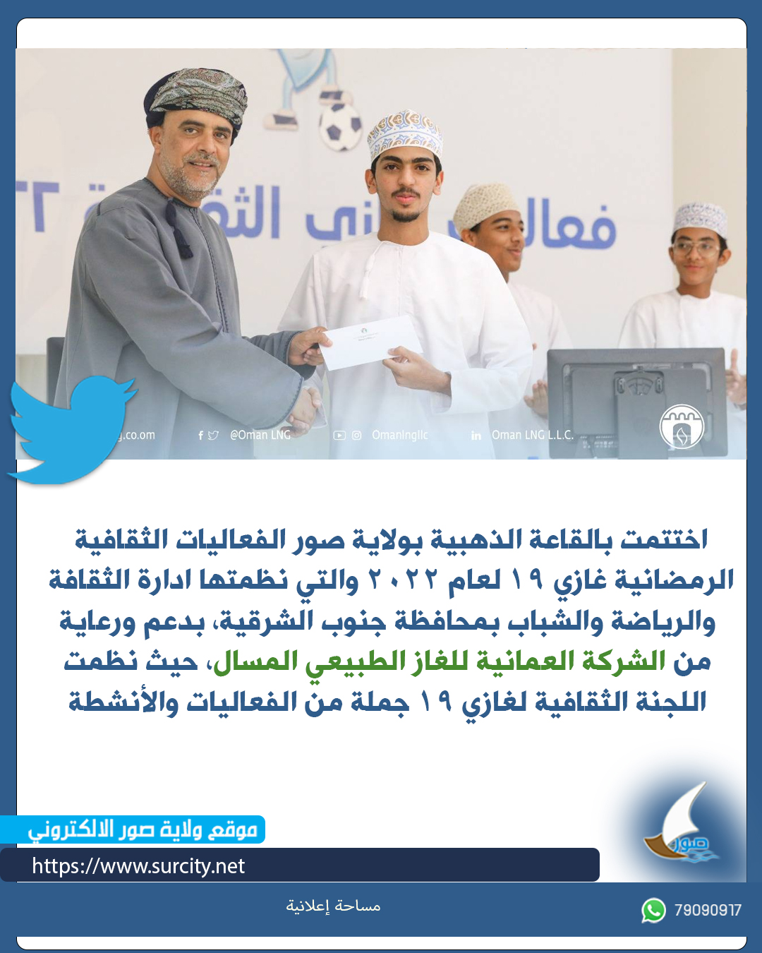 اختتمت بالقاعة الذهبية بولاية صور الفعاليات الثقافية الرمضانية غازي 19 لعام 2022 والتي نظمتها ادارة الثقافة والرياضة والشباب بمحافظة جنوب الشرقية، بدعم ورعاية من الشركة العمانية للغاز الطبيعي المسال، حيث نظمت اللجنة الثقافية لغازي 19 جملة من الفعاليات والأنشطة والتي شملت المسابقات الثقافية على مستوى المؤسسات الحكومية والخاصة للرجال والنساء وأخرى مسابقة غازي الثقافية للطلاب للفئة العمرية من 10 -17 سنة للمدارس الحكومية والخاصة إلى جانب تنظيم عرض مسرحي لفرقة صور المسرحية بعنوان عفسة وأمسية إنشادية إلى جانب محاضرة عن شخصية بيبي مريم التاريخية .