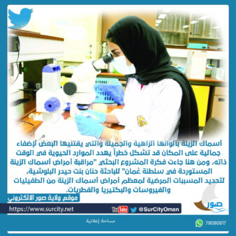 أسماك الزينة بألوانها الزاهية والجميلة والتي يقتنيها البعض لإضفاء جمالية على المكان قد تشكل خطراً يهدد الموارد الحيوية في الوقت ذاته، ومن هنا جاءت فكرة المشروع البحثي “مراقبة أمراض أسماك الزينة المستوردة في سلطنة عُمان” للباحثة حنان بنت حيدر البلوشية، لتحديد المسببات المرضية لمعظم أمراض أسماك الزينة من الطفيليات والفيروسات والبكتيريا والفطريات.