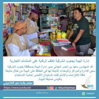 أكد المهندس سعيد بن ناصر العبدلي مدير إدارة البيئة بمحافظة جنوب الشرقية سعي الإدارة والمراكز والوحدات التابعة لها في الحفاظ على البيئة من خلال متابعة كافة الالتزامات والاشتراطات لاستبدال الأكياس أحادية الاستخدام بأكياس صديقة للبيئة.