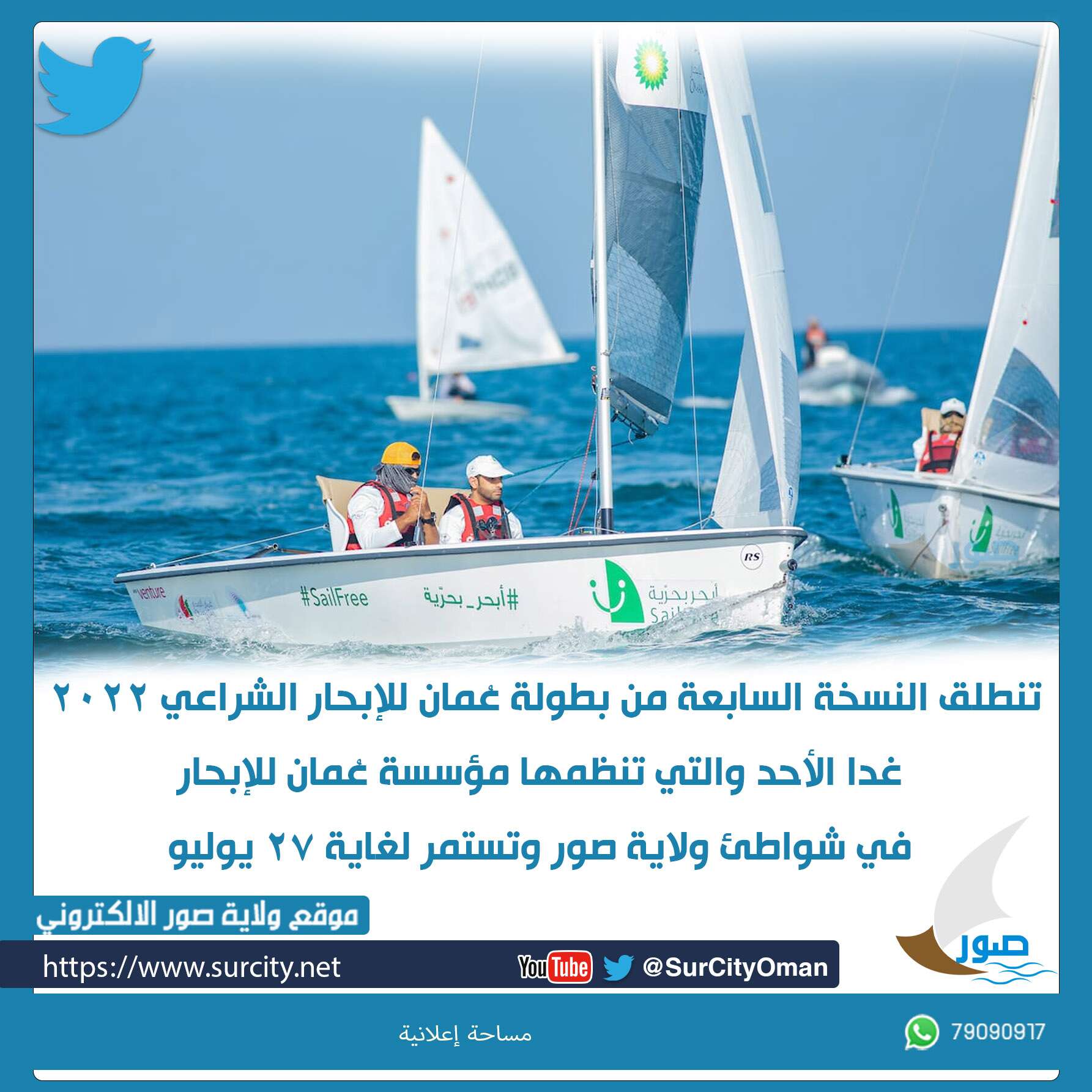 تنطلق النسخة السابعة من بطولة عُمان للإبحار الشراعي 2022، غدا الأحد، والتي تنظمها مؤسسة عُمان للإبحار في شواطئ ولاية صور وتستمر لغاية 27 يوليو.