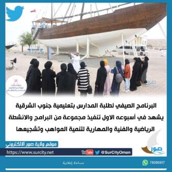 تتواصل بالمديرية العامة للتربية والتعليم بمحافظة جنوب الشرقية فعاليات البرنامج الصيفي لطلبة المدارس والذي تنظمه وزارة التربية والتعليم تحت شعار ( صيفي عودة وابداع ) ويستمر خلال الفترة من 24/7/2022 م لغاية يوم الخميس الموافق 4/8/2022م حيث يستهدف البرنامج 200 طالب وطالبة ممن أنهوا الصفوف من (6-11) موزعين في اربعة مراكز بولايات محافظة جنوب الشرقية وهي مركز مدرسة لبابة بنت الحارث بولاية صور للبنات ومركز مدرسة الحسن البصري بولاية الكامل والوافي للبنين ومركز مدرسة الإمام عبدالملك بن حميد بولاية جعلان بني بوحسن للبنين ومركز مدرسة بلاد بني بوعلي بولاية جعلان بني بوعلي للبنات