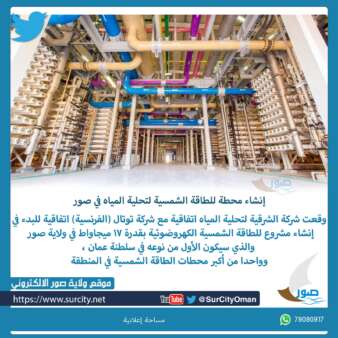 وقّعت كلّ من “توتال إنرجيز” و”فيوليا” اتّفاقيّة بناء أكبر نظامٍ للطاقة الشمسيّة الكهروضوئيّة، والذي يهدف إلى تشغيل محطّة تحلية المياه في عُمان وتحديدًا في ولاية صور.