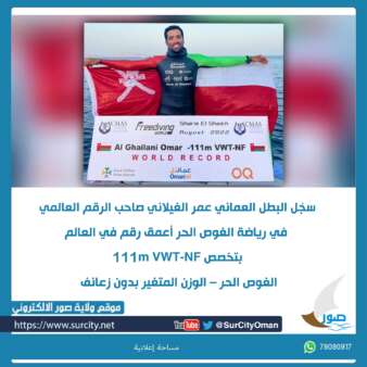 سجّل البطل العُماني عمر الغيلاني صاحب الرقم العالمي في رياضة الغوص الحر، أعمق رقم في العالم بتخصص VWT-NF 111m (الغوص الحر – الوزن المتغير بدون زعانف / Freediving variable weight- no fins).