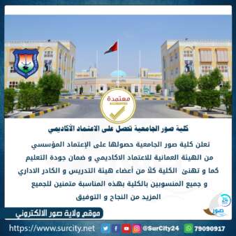 وقد كانت نتيجة عملية إعادة التقويم مقابل المعايير المؤسسية (المحاولة الثانية) لكلية صور الجامعية هي حصولها على “الاعتماد “، لتنضم بذلك إلى مؤسسات التعليم العالي التي سبق وأن اعتمدتها الهيئة، وهي كلية مجان الجامعية، وجامعة ظفار، وكلية الدراسات المصرفية والمالية، وكلية كالدونيان الهندسية (سابقا)، وجامعة صحار، والكلية الحديثة للتجارة والعلوم، وجامعة السلطان قابوس، والكلية العلمية للتصميم، وكلية الشرق الأوسط، والجامعة الألمانية للتكنولوجيا في عمان، وكلية البيان، وكلية البريمي الجامعية، وكلية الخليج.