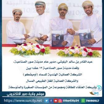 وقعت مدينة صور الصناعية، التابعة للمؤسسة العامة للمناطق الصناعية “مدائن” 13 عقد مناولة بين الشركات الكبيرة والمؤسسات الصغيرة والمتوسطة بقيمة 32 مليون ريال عماني، وبرنامج تعاون لتنفيذ مشروع تطوير وتعزيز البرنامج الوطني المتكامل للرصد والرقابة البيئية لشبكة محطات رصد جودة الهواء المحيط في ولاية صور بمحافظة جنوب الشرقية، برعاية سعادة الدكتور عبدالله بن علي العمري رئيس هيئة البيئة، وبحضور عدد من أصحاب السعادة والمسؤولين في القطاعين العام والخاص.