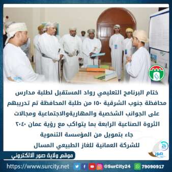 أختتمت المديرية العامة للتربية والتعليم بمحافظة جنوب الشرقية يوم أمس فعاليات البرنامج التعليمي رواد المستقبل لطلبة المدارس والذي جاء بتمويل من المؤسسة التنموية للشركة العمانية للغاز الطبيعي المسال ونفذته شركة سالكون للمعرفة الخاصة خلال الفترة من 25 سبتمبر إلى 4 أكتوبر 2022 واستهدف ما يقارب 150 من طلبة المحافظة من الصف التاسع إلى الثاني عشر