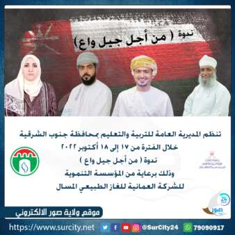تنظم المديرية العامة للتربية والتعليم بمحافظة جنوب الشرقية ممثلة بقسم الإرشاد والتوعية بدائرة التوجيه المهني والإرشاد الطلابي خلال الفترة من 17 إلى 18 أكتوبر 2022 ندوة ( من أجل جيل واع ) وذلك برعاية من المؤسسة التنموية للشركة العمانية للغاز الطبيعي المسال وبمشاركة مختلف المؤسسات ذات العلاقة حيث سيرعى افتتاح الندوة سعادة الدكتور يحيى بن بدر المعولي محافظ جنوب الشرقية وذلك يوم غد الأثنين بالقاعة الذهبية بولاية صور