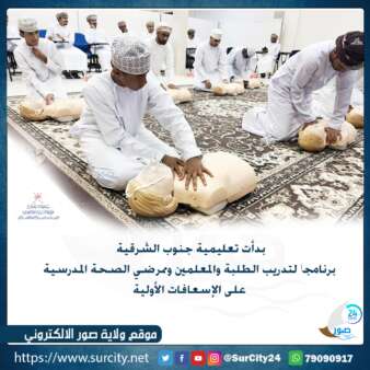 بدأت بالمديرية العامة للتربية والتعليم بمحافظة جنوب الشرقية فعاليات البرنامج التدريبي في الإسعافات الأولية والذي يأتي تنفيذه ضمن بنود مذكرة التفاهم الموقعة بين وزارة التربية والتعليم وشركة تنمية نفط عمان لتدريب الطلبة والمعلمين وممرضي الصحة المدرسية على الإسعافات الأولية سعيا من الوزارة لتكوين بيئة تربوية صحية في المدارس العمانية، وتوفير كادر متدرب قادر على تقديم خدمة الإسعافات الأولية في البيئة المدرسية حيث أقيم البرنامج في أسبوعه الأول بكلية عمان للعلوم الطبية بمحافظة جنوب الشرقية
