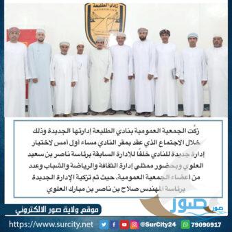 زكَّت الجمعية العمومية بنادي الطليعة إدارتها الجديدة وذلك خلال الاجتماع الذي عقد بمقر النادي مساء أول أمس لاختيار إدارة جديدة للنادي خلفًا للإدارة السابقة برئاسة ناصر بن سعيد العلوي وبحضور ممثلي إدارة الثقافة والرياضة والشباب وعدد من أعضاء الجمعية العمومية، حيث تم تزكية الإدارة الجديدة برئاسة المهندس صلاح بن ناصر بن مبارك العلوي والدكتور حمد بن علي بن عبدالله العلوي نائبًا للرئيس وحديد بن سبيت بن حساني العلوي أمينًا للسر وأحمد بن ماجد بن عبدالله العلوي أمينًا للصندوق وعضوية كل من المهندس محمد بن ناصر بن عبدالله العلوي ومنير بن أحمد بن مسلم العلوي ونصر بن سعيد بن ناصر العلوي والشيخ عبدالحكيم بن علي بن مسلم العلوي وهادي بن مسلم بن عبدالله العلوي.