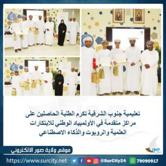 وقد رعى حفل التكريم والذي أقيم بقاعة مركز إعداد الناشئين بصور عبدالله بن علي الفوري المدير العام وبحضور مديرو العموم المساعدين والدكتور الخبير التربوي بمكتب المدير العام ومديرو الدوائر حيث شاركت المحافظة بستة مشاريع في مسابقات الابتكارات العلمية ومشروعين في مسابقة جلوب البيئي وثلاث فرق في مسابقة الروبوت وفريق واحد في مسابقة طائرة بدون طيار وقد حققت مدرسة السلطان قابوس المركز الأول في الابتكارات في مجال تقنية المعلومات فيما حققت مدرسة السلطان تركي بن سعيد المركز الأول في فئة الطائرات بدون طيار وحققت مدرسة السلطان تركي بن سعيد المركز الثاني في الروبوت لفئة الصفوف ٩- ١٠ في مسابقات الروبوت وحققت مدرسة الكامل للتعليم الأساسي المركز الثالث في الروبوت لفئة الصفوف ( ٧-٨) في مسابقات الروبوت وحققت مدرسة لبابة بنت الحارث للتعليم الأساسي المركز الثالث في مجال العلوم البيئية لمشروع استخلاص السيللوز واستخدامه في الأنشطة المضادة للجراثيم