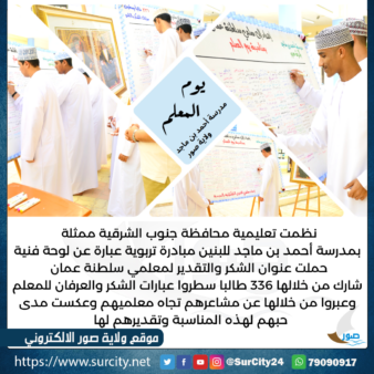 ابتهاجا بتخصيص مجلس الوزراء يوم 24 فبراير من كل عام إجازة للمعلمين والمعلمات والوظائف المساندة المرتبطة بها في المدارس الحكومية والخاصة وبمناسبة الاحتفال بيوم المعلم العماني لهذا وتقديرًا لمربي الأجيال نظمت تعليمية محافظة جنوب الشرقية ممثلة بمدرسة أحمد بن ماجد للبنين مبادرة تربوية عبارة عن لوحة فنية حملت عنوان الشكر والتقدير لمعلمي سلطنة عمان بإشراف قسم الفنون التشكيلية ممثلاً في المعلم خالد بن راشد المشرفي، والمعلم أشرف عبدالسلام حيزة شارك من خلالها 336 طالبا سطروا عبارات الشكر والعرفان للمعلم وعبروا من خلالها عن مشاعرهم تجاه معلميهم وعكست مدى حبهم لهذه المناسبة وتقديرهم لها