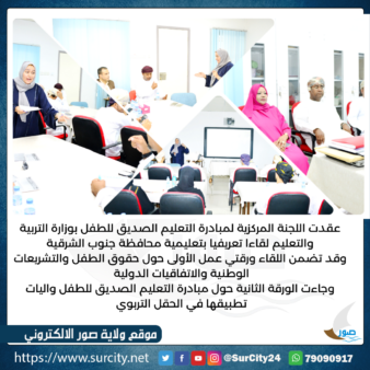 عقدت اللجنة المركزية لمبادرة التعليم الصديق للطفل بوزارة التربية والتعليم يوم أمس الأحد لقاءا تعريفيا بتعليمية محافظة جنوب الشرقية استهدف مديري المدارس المطبقة للمبادرة والأخصائيين الاجتماعيين والنفسين ومشرفين التربية الخاصة حيث تكون الفريق الزائر من شنونه بنت سالم الحبسية المديرة العامة المساعدة للتربية الخاصة رئيسة اللجنة المركزية لمبادرة التعليم الصديق للطفل وعضوية كل من الدكتورة ناجية بنت عبيد بن سالم الكعبية رئيسة قسم التعليم المبكر بالمديرية العامة للتربية والتعليم بمحافظة مسقط .