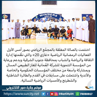 اختتمت بالصالة المغلقة بالمجمَّع الرياضي بصور أمس الأول الفعاليات الرمضانية الرياضية «غازي 20» والتي نظَّمتها إدارة الثقافة والرياضة والشباب بمحافظة جنوب الشرقية وبدعم ورعاية من المؤسسة التنموية للشركة العُمانية للغاز الطبيعي المسال وبمشاركة واسعة من مختلف المؤسسات الحكومية والخاصة والأندية واشتملت على مسابقات في القدم والطائرة الشاطئية والشطرنج والأمسيات الرياضية النسائية.