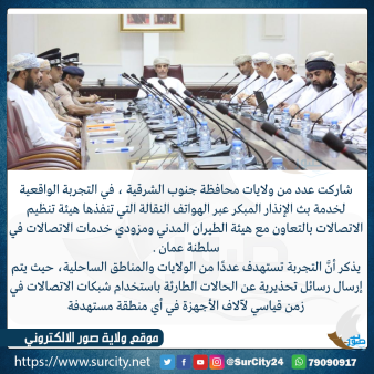 شاركت عدد من ولايات محافظة جنوب الشرقية ، في التجربة الواقعية لخدمة بث الإنذار المبكر عبر الهواتف النقالة التي تنفذها هيئة تنظيم الاتصالات بالتعاون مع هيئة الطيران المدني ومزودي خدمات الاتصالات في سلطنة عمان .