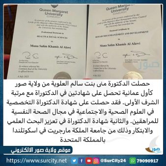 نالت الباحثة منى بنت سالم بن خميس العلوية من ولاية صور شهادتي الدكتوراه بأمتياز مع مرتبة الشرف من جامعة الملكة مارجريت في اسكوتلندا بالمملكة المتحدة، حيث حصلت على شهادة الدكتوراة التخصصية في العلوم الصحية والاجتماعية في مجال الصحة النفسية للمراهقين والثانية شهادة الدكتوراة في تعزيز البحث العلمي والابتكار.