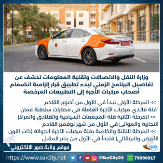 كشفت وزارة النقل والاتصالات وتقنية المعلومات عن تفاصيل البرنامج الزمني لبدء تطبيق قرار إلزامية انضمام أصحاب مركبات الأجرة إلى التطبيقات المرخصة من الوزارة عبر ثلاث مراحل زمنية.