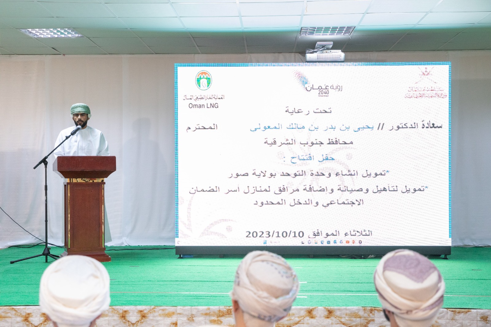 كما القى باسم بن ناصر البطاشي مدير التنمية المستدامة بالمؤسسة التنموية للشركة العمانية للغاز الطبيعي المسال كلمة المؤسسة الداعمة قال فيها نشهد تدشين مشروع وحدة التوحد ومشروع تأهيل وصيانة وإضافة مرافق لمنازل أسر الضمان الاجتماعي والدخل المحدود هنا في ولاية صور حيث تأتي هذه المشاريع كثمرة جهود الشراكة الاستراتيجية بين وزارة التنمية الاجتماعية والشركة العُمانية للغاز الطبيعي المسال.