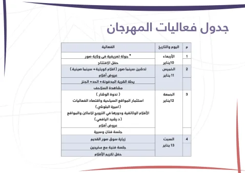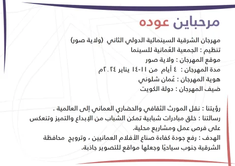 صور في 30 ديسمبر /العُمانية/ كشفت الجمعية العمانية للسينما واللجنة المنظمة لمهرجانِ الشرقية السينمائي الدولي الثاني اليوم بولايةِ صور عن تفاصيلِ المهرجان، الّذي ستبدأ أعماله في الولايةِ بمحافظةِ جنوبِ الشرقية في 11 من يناير المُقبل، ويستمر لأربعةِ أيامٍ متتاليةٍ بمشاركةِ مجموعةٍ من الفنانين ونجوم السينما من داخلِ سلطنةِ عُمان ودول الخليج والوطن العربي.