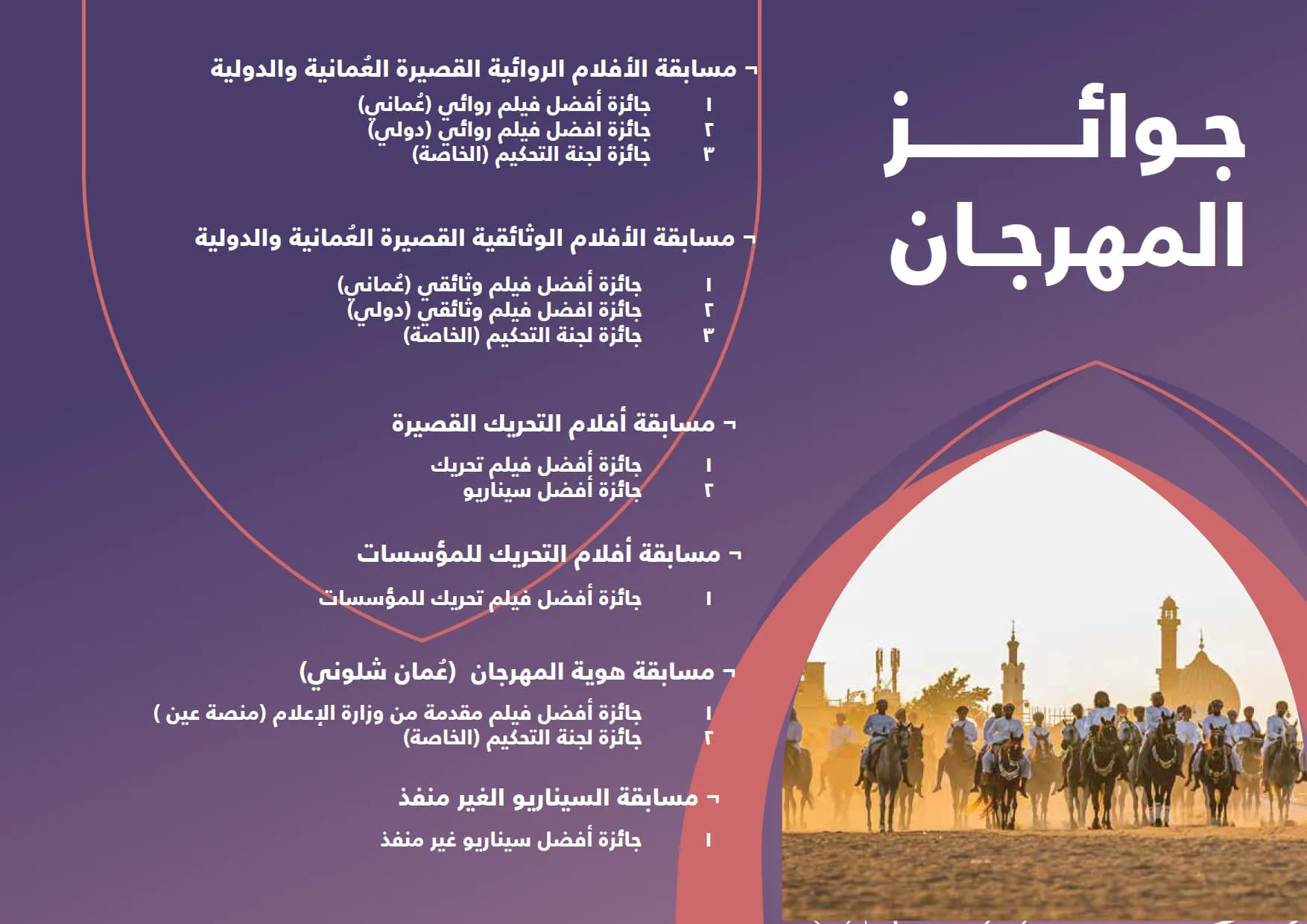 وفي فئة مسابقة الأفلام الوثائقية القصيرة العُمانية والدولية، جائزة أفضل فيلم وثائقي (عُماني)، وجائزة أفضل فيلم وثائقي (دولي)، وجائزة لجنة التحكيم (الخاصة)، وفي فئة مسابقة أفلام التحريك القصيرة، جائزة أفضل فيلم تحريك، وجائزة أفضل سيناريو .