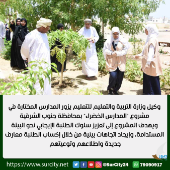 قام سعادة الأستاذ الدكتور عبدالله بن خميس أمبوسعيدي، وكيل وزارة التربية والتعليم للتعليم ورئيس اللجنة الرئيسية لمشروع المدارس الخضراء، بزيارة لتعليمية محافظة جنوب الشرقية والتي تأتي تأكيدًا على اهتمام الوزارة بهذا المشروع وتشجيعها للمدارس المشاركة فيه وقد رافقه في هذه الزيارة عبدالله بن علي الفوري مدير عام تعليمية جنوب الشرقية، وبدرية بنت ناصر العريمية المديرة العامة المساعدة لشؤون التعليم ، وعدد من أعضاء الفريق الوزاري والمحلي.
