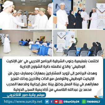 اختتمت بتعليمية جنوب الشرقية البرنامج التدريبي في “فن الإتكيت الوظيفي” والذي نظمته دائرة الشؤون الإدارية ، ممثلة بقسم التدريب والتأهيل بالقاعة الثقافية بمركز الناشئين بإدارة الثقافة والرياضة والشباب بولاية صور على مدى ثلاثة أيام واستهدف 25 متدربًا من مدراء ومساعدي الدوائر ورؤساء الأقسام بالمديرية والمؤسسات الحكومية بالمحافظة وهدف البرنامج إلى تزويد المشاركين بمهارات ومعارف حول فن الإتيكيت الوظيفي والتواصل مع الذات والآخرين وذلك لتعزيز مهاراتهم في بيئة العمل وخلق بيئة عمل إيجابية وقدمها المدرب محمد بن عبدالله القاسمي من أكاديمية السجى الدولية، محتوى علميًا غنيًا حول “فن الإتيكيت الوظيفي” وهو مجموعة من الممارسات والسلوكيات الاجتماعية والتجارية التي يجب أن يلتزم بها المهنيون في بيئة العمل .