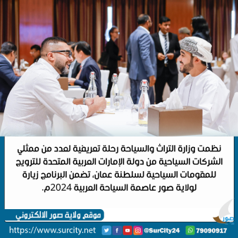 نظمت وزارة التراث والسياحة رحلة تعريفية لعدد من ممثلي الشركات السياحية من دولة الإمارات العربية المتحدة للترويج للمقومات السياحية لسلطنة عمان، تضمن البرنامج زيارة لولاية صور عاصمة السياحة العربية 2024م، إلى جانب عقد لقاءات ثنائية بين ممثلي الشركات السياحية الإماراتية ونظائرهم من شركاء القطاع في سلطنة عمان.