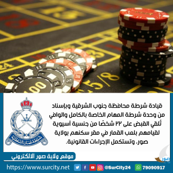 قيادة شرطة محافظة جنوب الشرقية وبإسناد من وحدة شرطة المهام الخاصة بالكامل والوافي تُلقي القبض على ٢٢ شخصًا من جنسية آسيوية لقيامهم بلعب القمار في مقر سكنهم بولاية صور، وتستكمل الإجراءات القانونية.