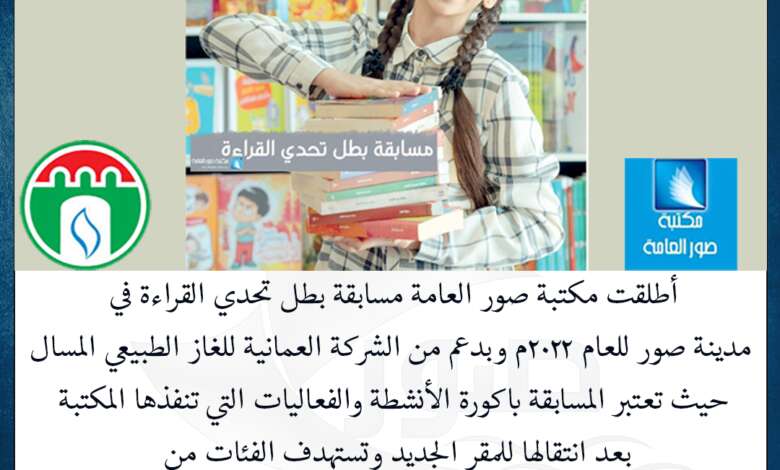 أكمل القراءة »صور ـ عبدالله بن محمد باعلوي:أطلقت مكتبة صور العامة مسابقة بطل تحدي القراءة في مدينة صور للعام 2022م وبدعم من…